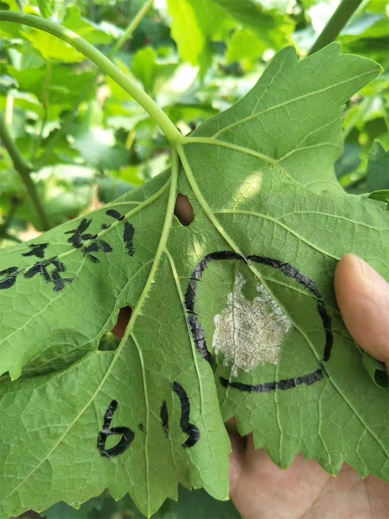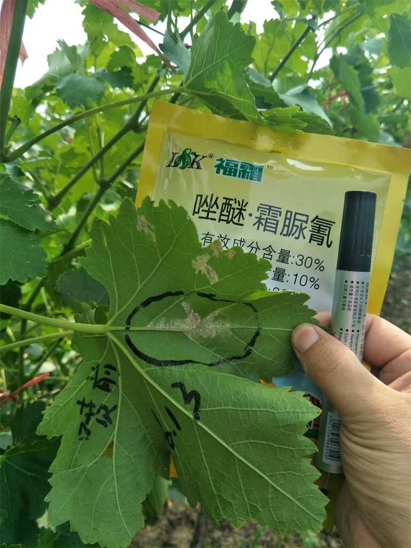 眾所周知,陜西省渭南市葡萄種植面積在全國傲居前線,作為葡萄的重要病害——霜霉病一直是困擾種植戶的頭等病害,常規(guī)霜霉病產(chǎn)品主要以預(yù)防為主,******效果不是很明顯,尤其是霜霉病發(fā)病中后期,常規(guī)******劑基本沒效果,針對這種情況,綠康實業(yè)有限公司陜西片區(qū)業(yè)務(wù)經(jīng)理譚戰(zhàn)于6月13日,帶著公司新產(chǎn)品“福霜”深入葡萄種植戶樊大姐家的地里,挑選出一片霜霉病發(fā)病較重的地塊,展開了福霜針對霜霉病的效果驗證。